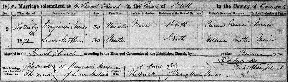 1841 Benjamin is at home aged 1. In 1851 he is at home aged 12 and a Tin Miner. In 1861 he is at home aged 21 and a Copper & Tin Miner In 1871 he is aged 30 and a Miner living with his brother William in Bosworgie. Married Louisa Smitham in St Erth Church on 14 SEP 1871 |