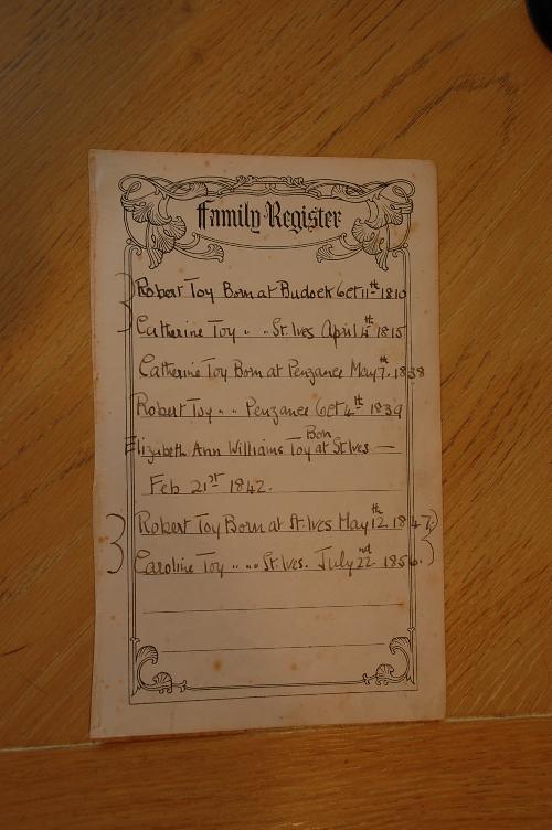 (In 1841 Robert is aged 30 and a Baker. Catherine is aged 25. The family is living in Pudding Bag Lane, St Ives) (In 1851 Robt Toye is aged 40 and a Master Baker. Cathn is aged 35. The family is living in Digey, St Ives) (In 1861 Robert is aged 57 and a Master Grocer. Catherine is aged 45. The family is living in Chyanchy, St Ives) (In 1871 Robert is aged 60 and a Baker. Catherine is aged 54. The family is living in Belle Air, St Ives) (Catherine the wife of Mr Robert Toy died on 31 JUL 1873 - opc database) (In 1881 Robert is aged 70 and a Baker. The family is living in Bellays Terrace, St Ives) (Robert died in the JUN quarter 1890 aged 79 - Penzance 5c 180) |