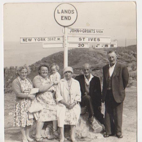 | Abraham and Clara on their Golden Wedding with the Mayor and Mayoress of St Ives | Abe and Clara (holding granddaughter Pauline) with friends at Lands End |