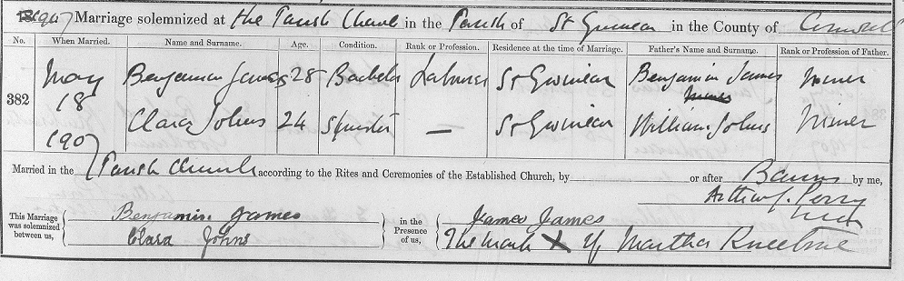 is at home aged 4 and a Scholar In 1891 he is at home aged 14 and a Farm Labourer In 1901 he is at home aged 23 and an Ordinary Ag Lab Married Clara Stevens on 21 FEB 1903 in Wall, Gwinear |