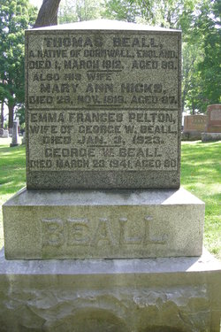 Mary Ann Hicks on 27 JUN 1849 in Algoma, Ontario (In 1851 Thomas is aged 24. Mary is aged 22. The family is living in Whitby, Ontario) (In 1861 Thomas is aged 33 and a Watch Maker. Mary is aged 30. The family is living in Mariposa, Victoria, Ontario) (In 1871 Thomas is aged 43 and a Jeweller. Mary is aged 39. The family is living in Lindsay, Victoria, Ontario) (In 1881 Thomas is aged 52 and a Gentleman. Mary is aged 48. The family is living in Lindsay, Victoria, Ontario) (In 1891 Thomas is aged 63. Mary is aged 59. They are living in Lindsay) (In 1901 Thomas is aged 72 and a Fruit Grower. He is living next door to his son and family in Lindsay) (Thomas died on 1 MAR 1912 in Lindsay) |