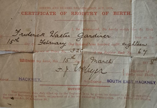 | Frederick Walter Gardiner | Born on 15 FEB 1918 in Homerton | In 1921 he is at home aged 3 Married Renee Haley in 1939 |