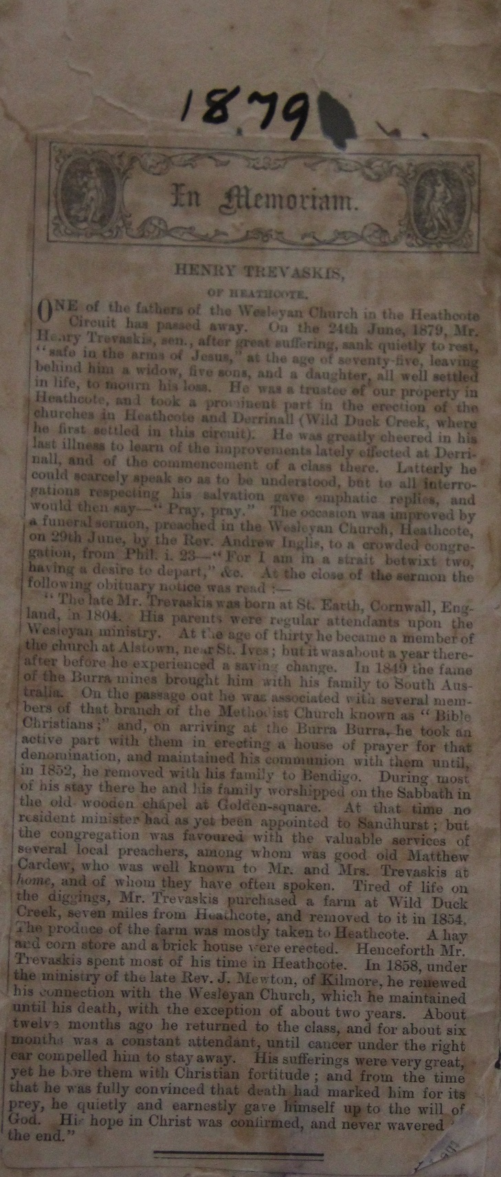 | James Trevaskis | 22 APR 1842 in Marazion | Died on 22 FEB 1912 in Coburg, Victoria |