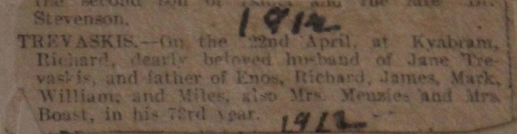 | Richard Henry Trevaskis | 18 JAN 1870 in Wahring, Victoria | Married Emma Jane Gerrard. Richard died on 18 NOV 1937 in Avenel, Victoria Emma died in 1941 |