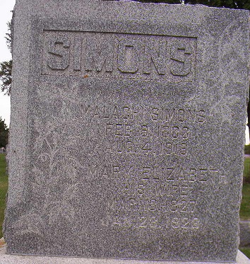 Simons married Mary Elizabeth Sermmens on 11 MAY 1852 (In 1860 Malachi is aged 27 and a Miner. Mary is aged 32. The family is living in Jamestown, Grant County, Wisconsin) (In 1870 Malachi is aged 35 and a Farmer. Elizabeth is aged 41. The family is living in Fennimore, Grant Co) (In 1880 Malachi is aged 47 and a Farmer. Mary is aged 52. The family is living in Mount Ida, Grant Co) (In 1900 Malachi is aged 67 and a Capitalist. Mary is aged 73. The family is living in Fennimore Village, Grant Co) (Malachi died on 4 AUG 1919 aged 86. Buried in Prairie Cemetery) (Mary died on 28 JAN 1928 aged 100. Buried in Prairie Cemetery) |